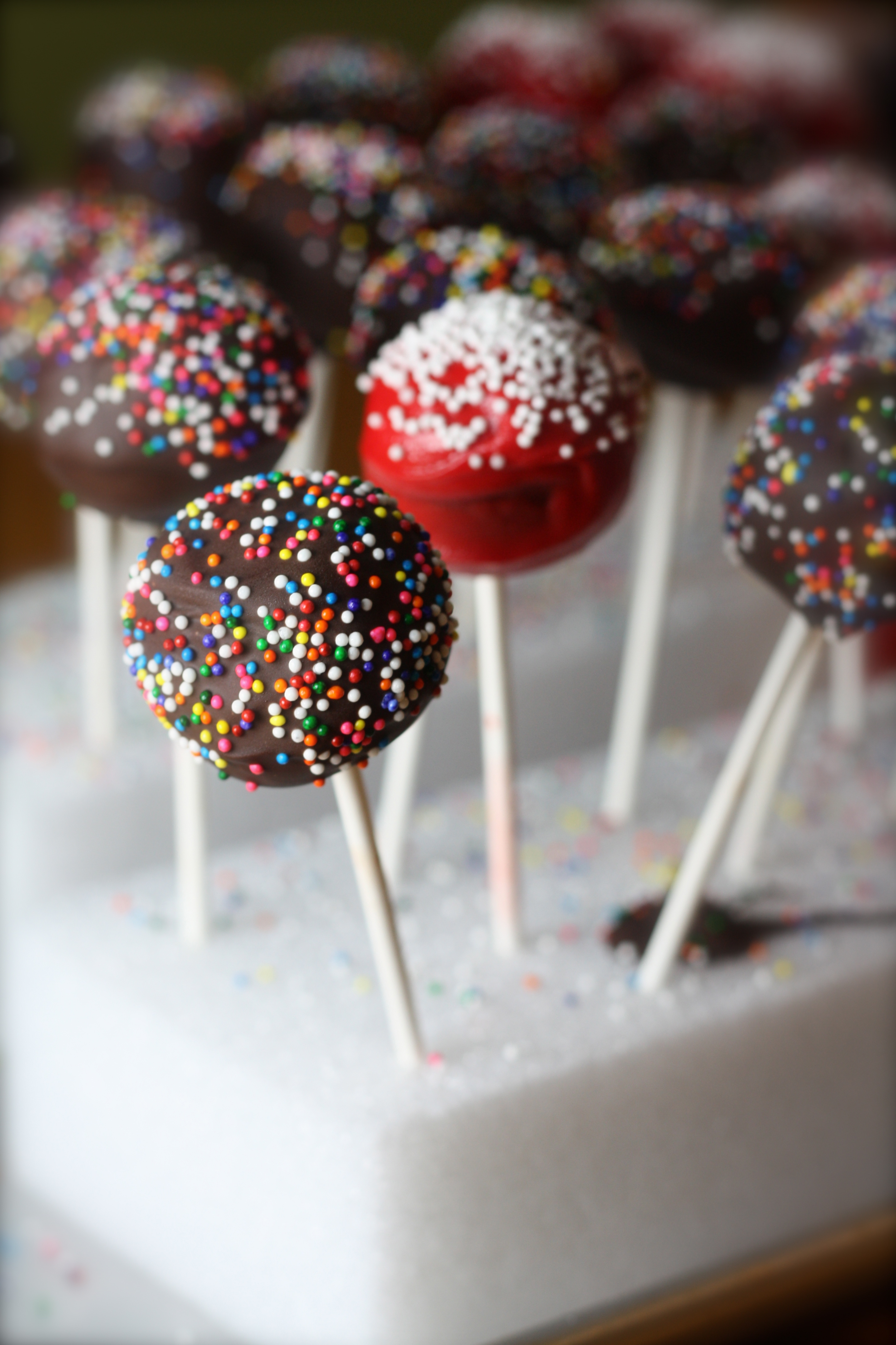 Decorate with sprinkles or candies, if desired. Then, place each pop into a piece of styrofoam to dry upright at room temperature. (Refrigeration will cause condensation on the surface of your pops. Another lesson learned the hard way.) The candy exterior will harden at room temperature.