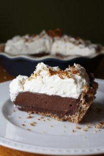 But, get your cozy-pants out for this one, because you’re going to want that elastic waistband. It’s a chocolate pudding pie with a irresistible twist. We’ll start with a pretzel crust, lined in rich chocolate ganache. Then we’ll fill the chocolate-covered pretzel crust with smooth chocolate pudding and fresh whipped cream.