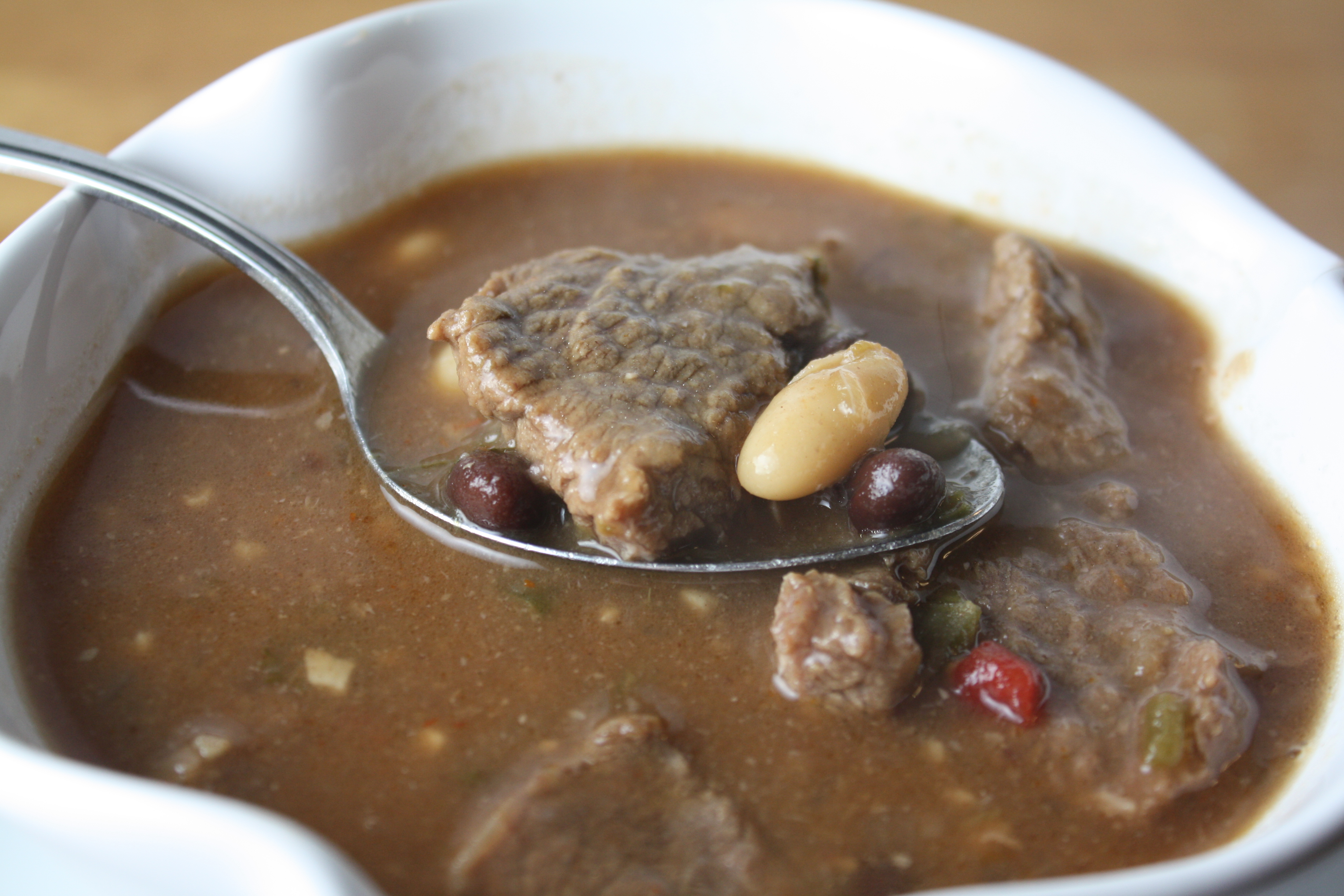 It IS winter time though, so if you’re freezing cold, it’s probably with good reason. And I’ve got just the thing to warm you up! Winter is the time for foods which fill our bellies and leave us feeling all toasty and satisfied. January also happens to be National Soup Month. So, it’s the perfect time for this Spicy Beef and Bean Stew, made with tender, slow-cooked beef and fresh jalapeño peppers. The broth gets its thickness from a puree of white beans, rather than the typical butter/flour roux. This is a rich and satisfying stew, which also happens to be extra-rich in protein and lower in high glycemix index carbs than traditional flour-thickened meat and potato stews!!