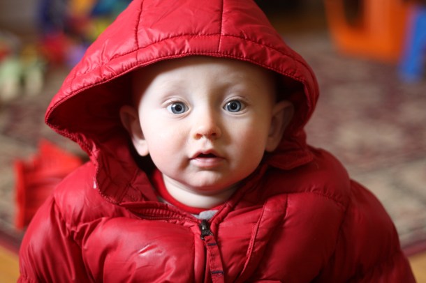 His sweet little head is already peppered with pale yellow bruises. Seriously, do you think people would laugh if I wrapped him in bubble wrap? He’s just too stinkin’ cute to be bruised. What if I just turned down the heat and dressed him all day in his puffy winter coat? It won’t be long before he’s chasing his brothers around the house. Everything always seems to happen so fast from this point.