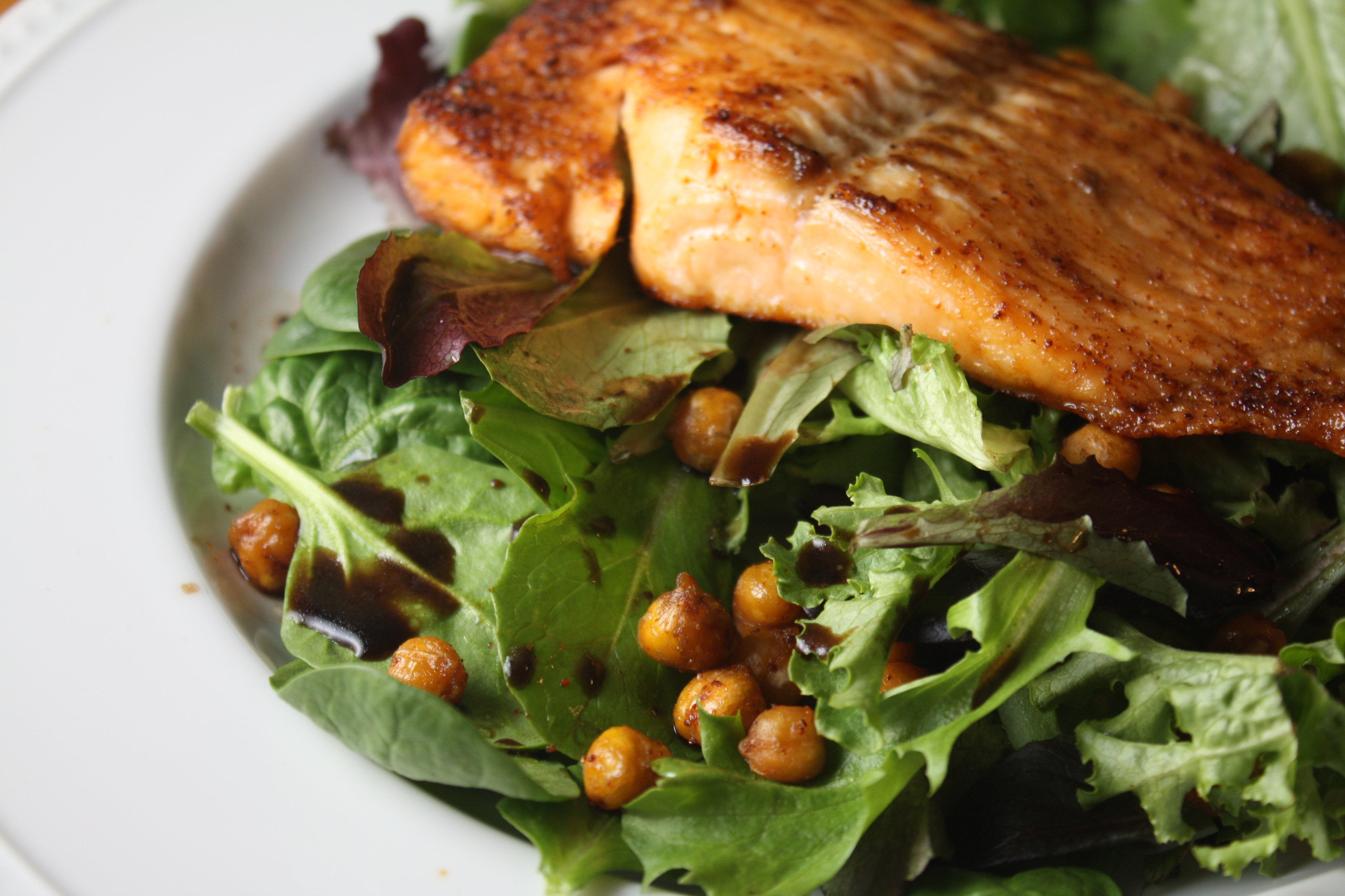 Leftover roasted chickpeas sprinkled over mixed green salad with broiled salmon