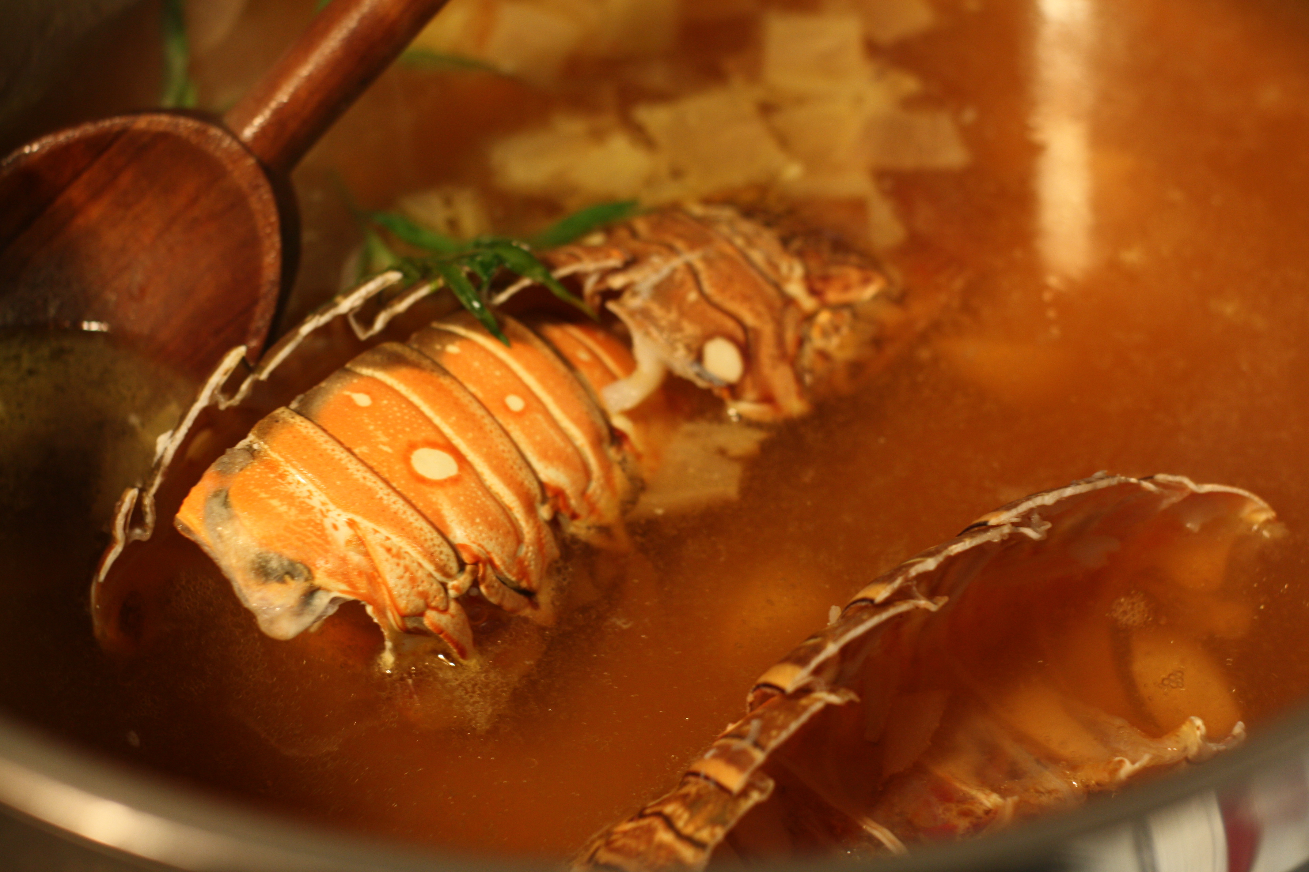 To prepare the enriched seafood broth: Heat olive oil in a large pan over medium heat. Add the shallots and garlic. Cook for a few minutes. Add the madeira wine to the pan. Then, add the seafood stock, lobster shells, and tarragon. Simmer, uncovered, for about 20 minutes, until the liquid has reduced by half. Strain the broth. Discard the lobster shells, garlic, and shallots. You should be left with 2 cups of broth. (If you have less than 2 cups, add a little water. If you have more than 2 cups, simmer until only 2 cups remain.)