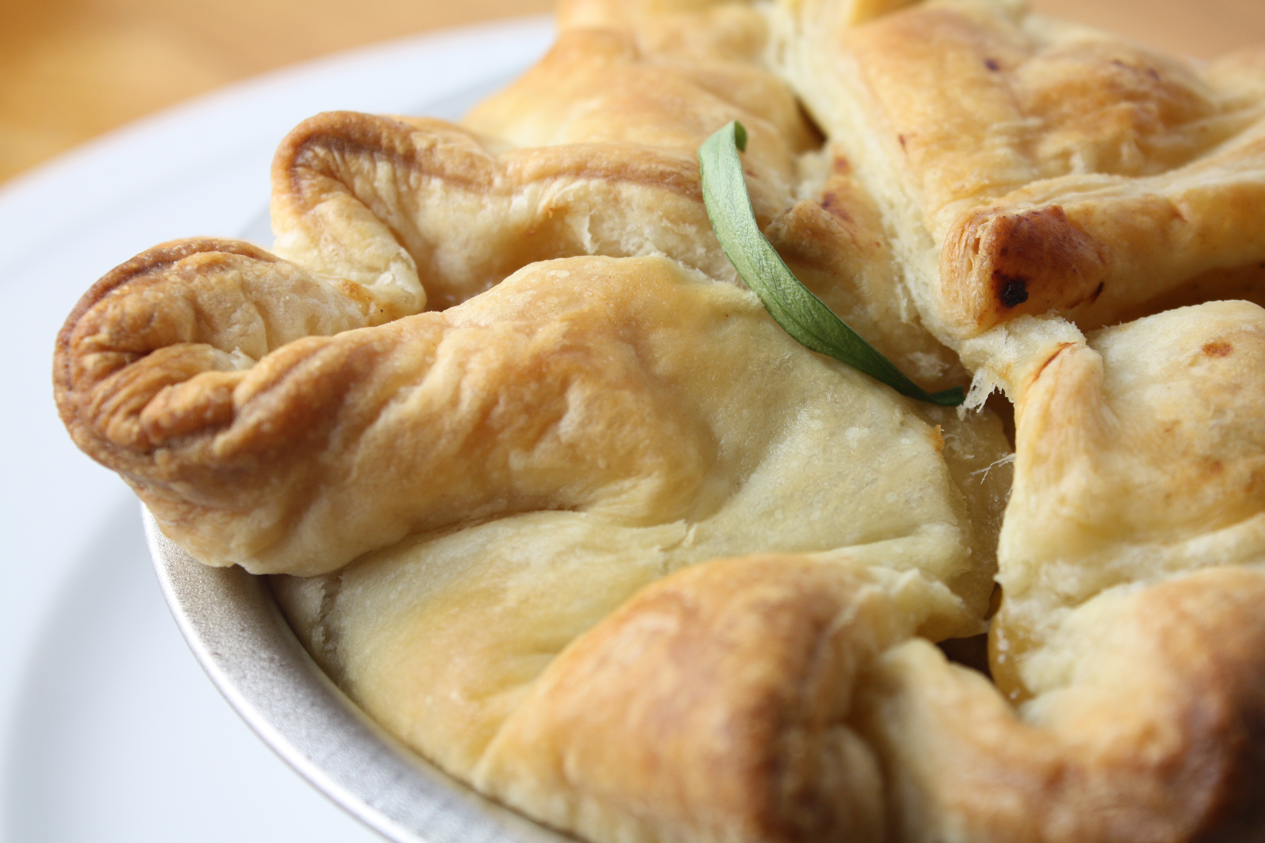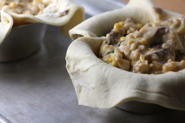 To prepare the pot pies: Preheat oven to 375 degrees. Spray two mini pie pans with non-stick spray. Slightly roll out each of the puff pastry sheets, so they are about 1/8″ thick. Cut the pastry into squares, big enough to fit the pie pan. (Once inserted, the pastry should come up to all edges, with four larger corners that will be folded over the top.) Press the pastry into the pie pans. Fill each pie with a generous scoop of the filling. Fold over the four pastry corners and gently press together in the center. Place the prepared pies on a baking sheet. Bake for about 35-40 minutes, until the filling is piping hot and the crust is golden brown and fully-cooked.