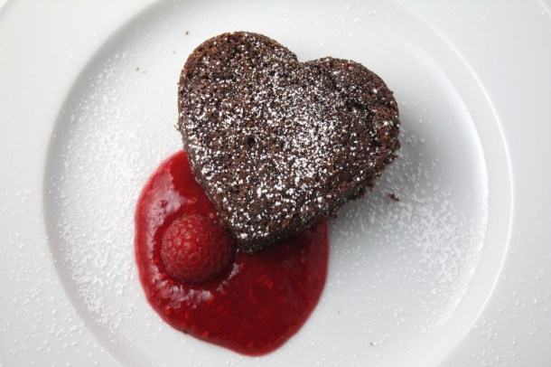 And for dessert…my World’s Simplest Fudgey Brownies, cut into heart shapes, and served on a bed of raspberry coulis.