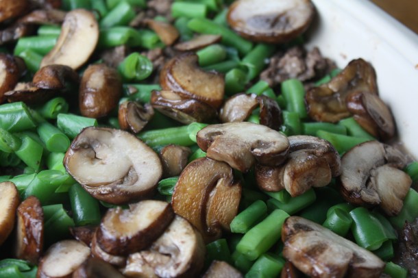 For the veggies:Β Wipe out the pan used for the beef. Heat olive oil over medium heat. Add the sliced mushrooms. Cook for 7-10 minutes, until golden and tender. Scatter the mushrooms and the steamed green beans in an even layer over the meat.