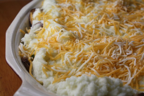 With St. Patty’s Day just around the corner, comforting meat-and-potato type meals are on my mind. But potatoes fall firmly into that refined carb category which I’m aiming to avoid. Fortunately, that doesn’t mean you can’t enjoy some comforting Irish cookin’ with just a few substitutions. You may remember a few weeks ago, when I shared a recipe for mashed cauliflower, which makes a wonderful substitution for mashed potatoes…a substitution which would also make the perfect topping for a low-carb, South Beach friendly cottage pie. Using lean ground beef and part-skim cheese helps lighten the meal even more, without sacrificing any flavor. Furthermore, making low-glycemic index choices for the veggie layer keeps this dish nicely in line with my diet plan.