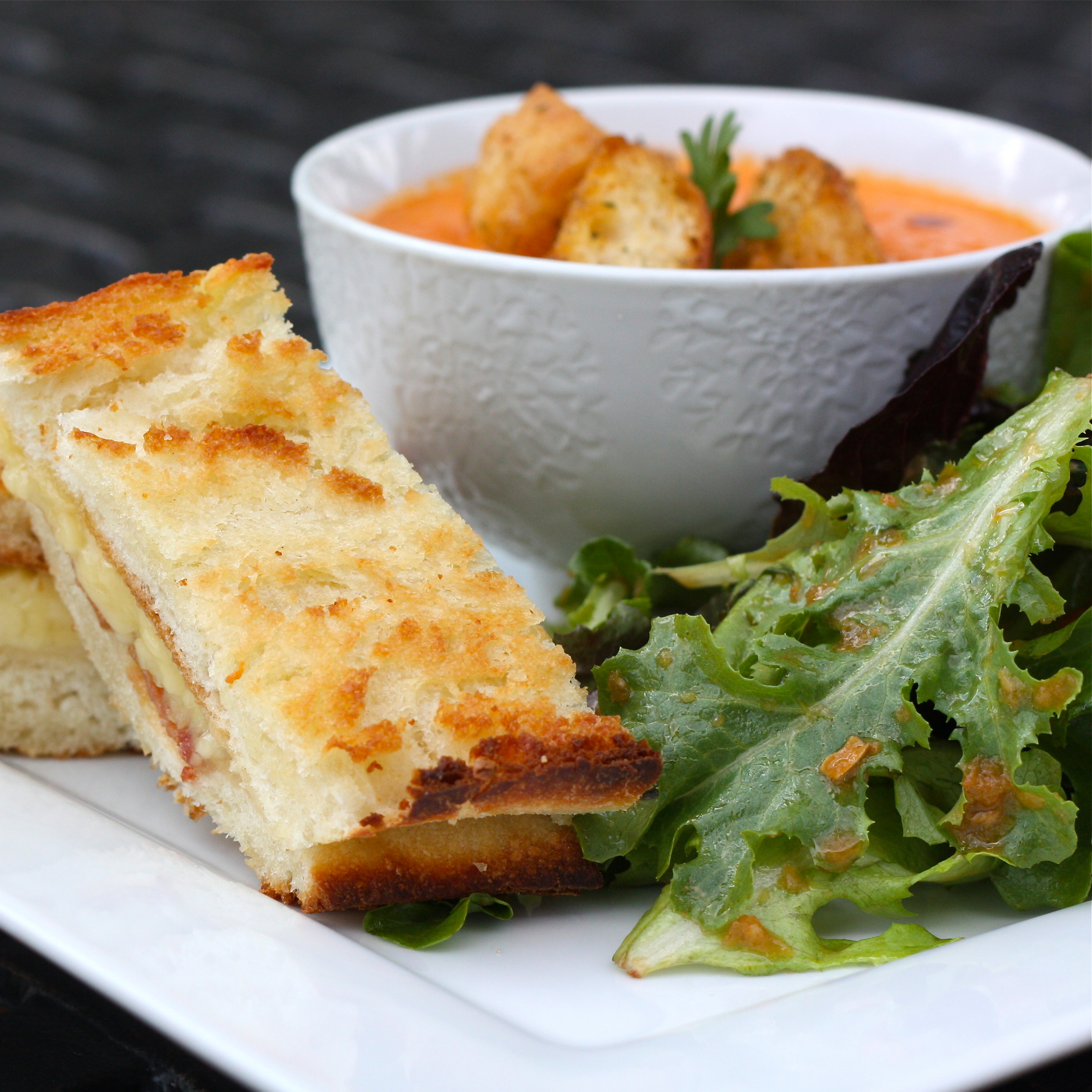 I give my tomato soup a spicy, smokey flavor with the addition of a chipotle pepper. A bit of heavy cream balances the spice and gives the soup a rich texture. The soup is garnished with a few homemade croutons and a couple dashes of chipotle tabasco sauce. On the side, I served a simple mixed green salad tossed in a ginger vinaigrette and grilled brie and gouda with bacon on French baguette. I’m fairly certain that the Xbox would have been incapable of coming up with something so perfectly simple and delicious as this…but don’t tell the Xbox I said that.
