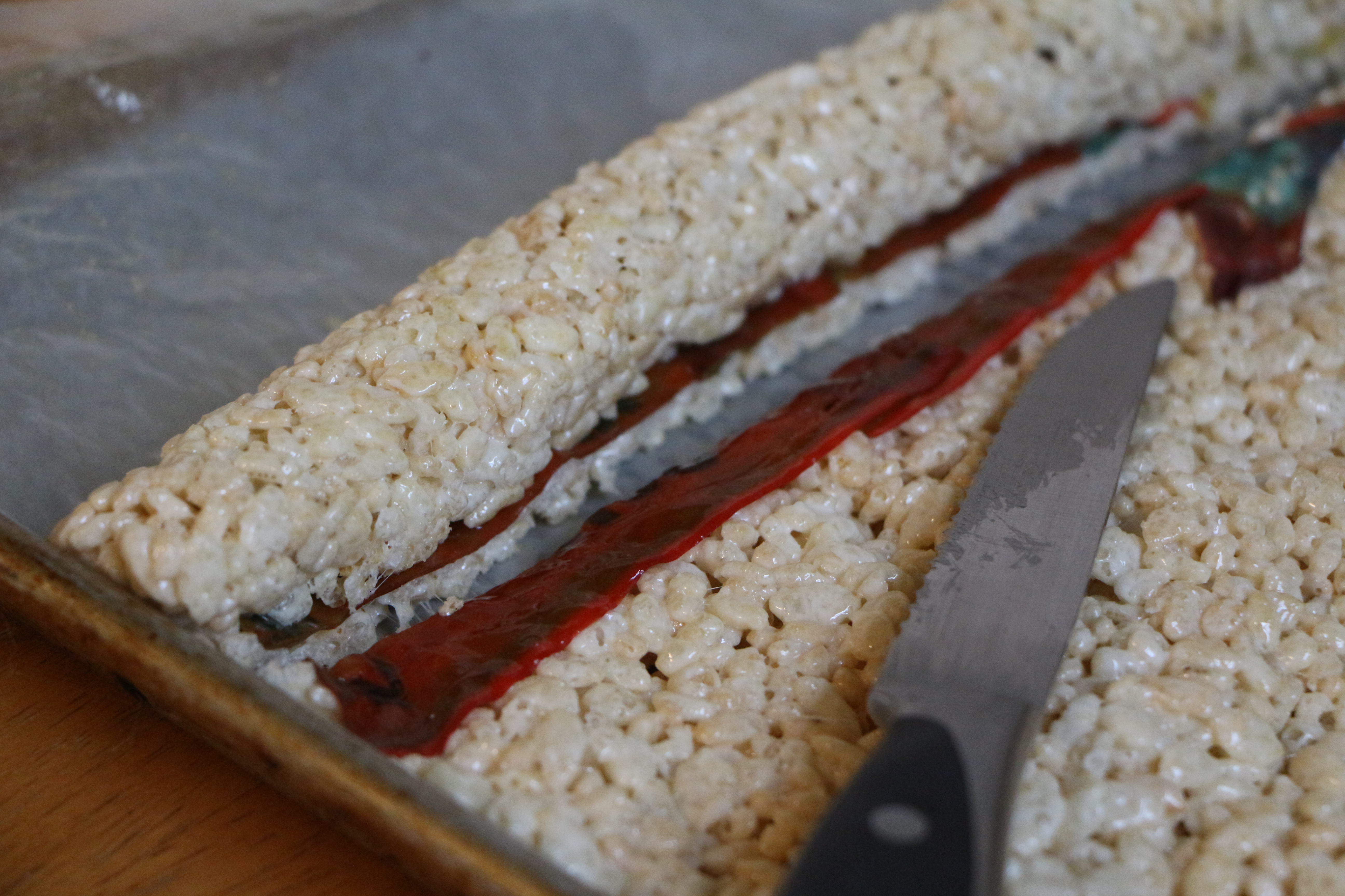 Step 3: Using a child-safe knife, carefully chop 7 or 8 cake-style donuts into chunks. You can use plain, powdered, cinnamon, or apple-cider donuts. (We used a variety pack of plain/powdered/cinnamon Entermann’s donuts.)