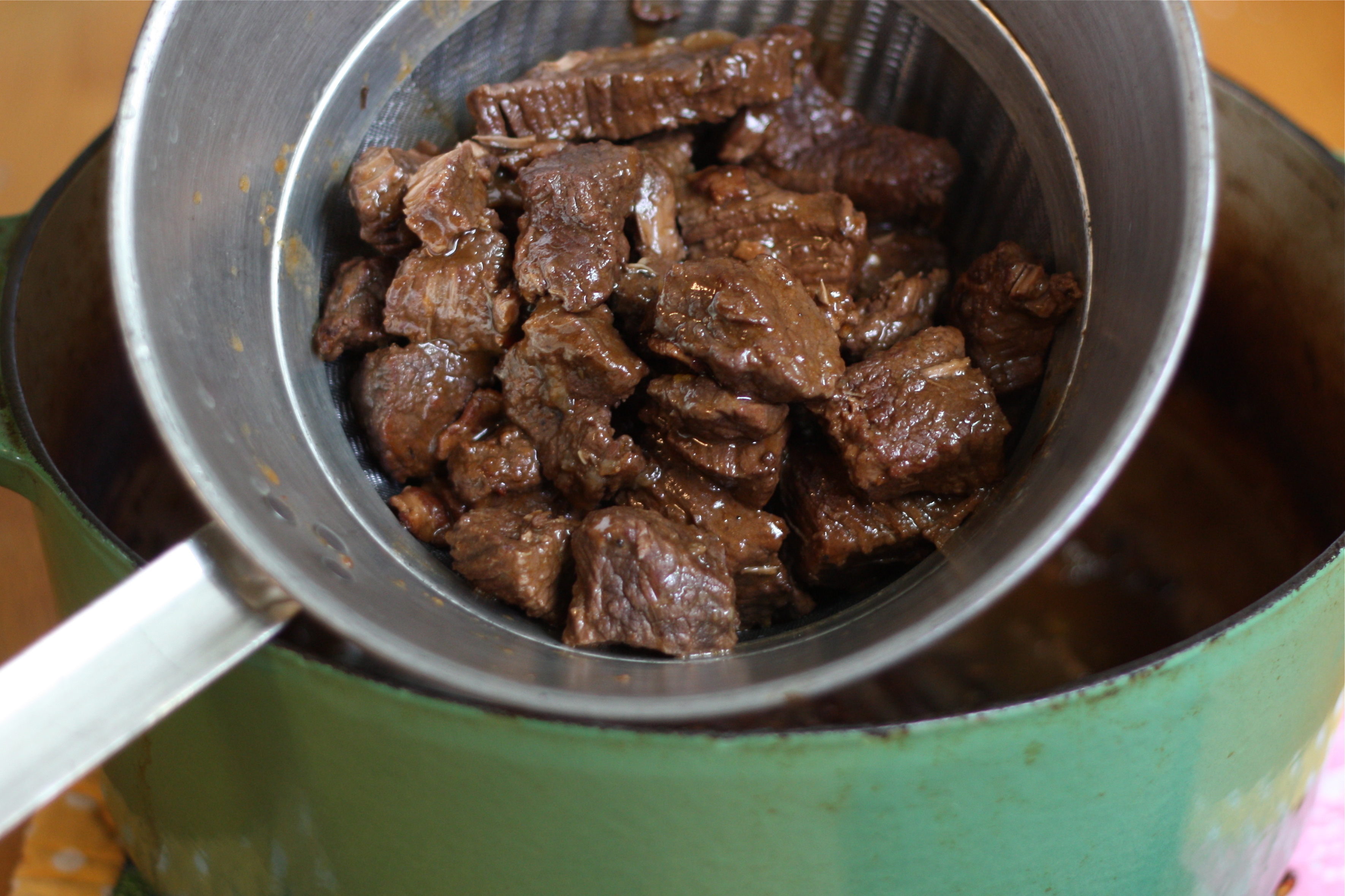 Once the beef has finished cooking, carefully pour the mixture through a sieve or strainer. Allow the sauce to collect in a large measuring cup (the 4-cup kind) or glass bowl. Return the beef and bacon to the dutch oven pan. Discard the carrot and onion pieces.