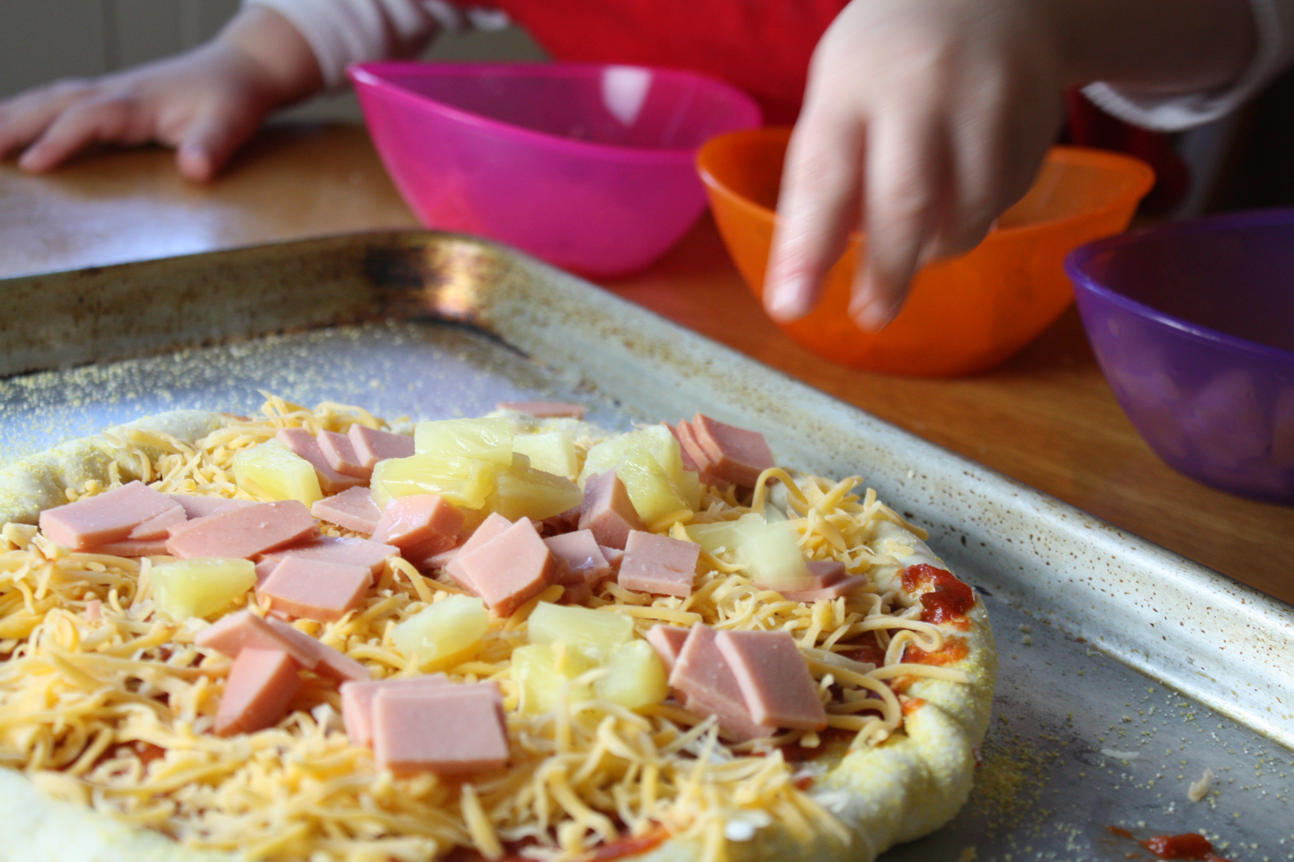 Use your fingers to create three shallow wells in the pizza toppings. Carefully crack an egg into each well.
