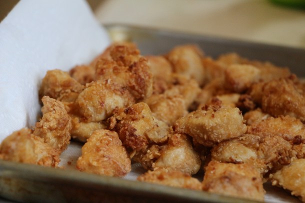 Remove the chicken from the marinade. Place the chicken in a bowl with the lightly beaten eggs. Remove the chicken from the eggs, then dredge in the cornstarch until well coated. Fry the chicken in small batches until crispy, golden, and cooked through, about 5-6 minutes. Turn the chicken once or twice during cooking. Remove the chicken from the oil with a slotted spoon and drain on a paper towel.