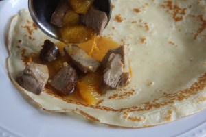**If you wish to make this duck a l’orange to serve in a way other than with crepes, you can follow the same procedure, but slice the duck, rather than cutting it into small pieces. Also, you can omit the cornstarch in the sauce. I added cornstarch to thicken the sauce to prevent the crepes from getting soggy, but if you’re not serving the dish with crepes, this is not a concern.
