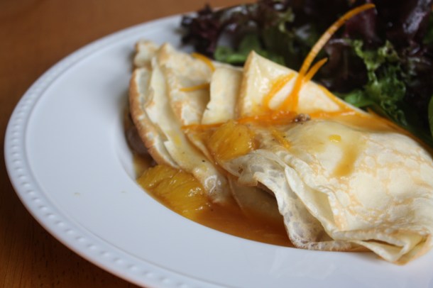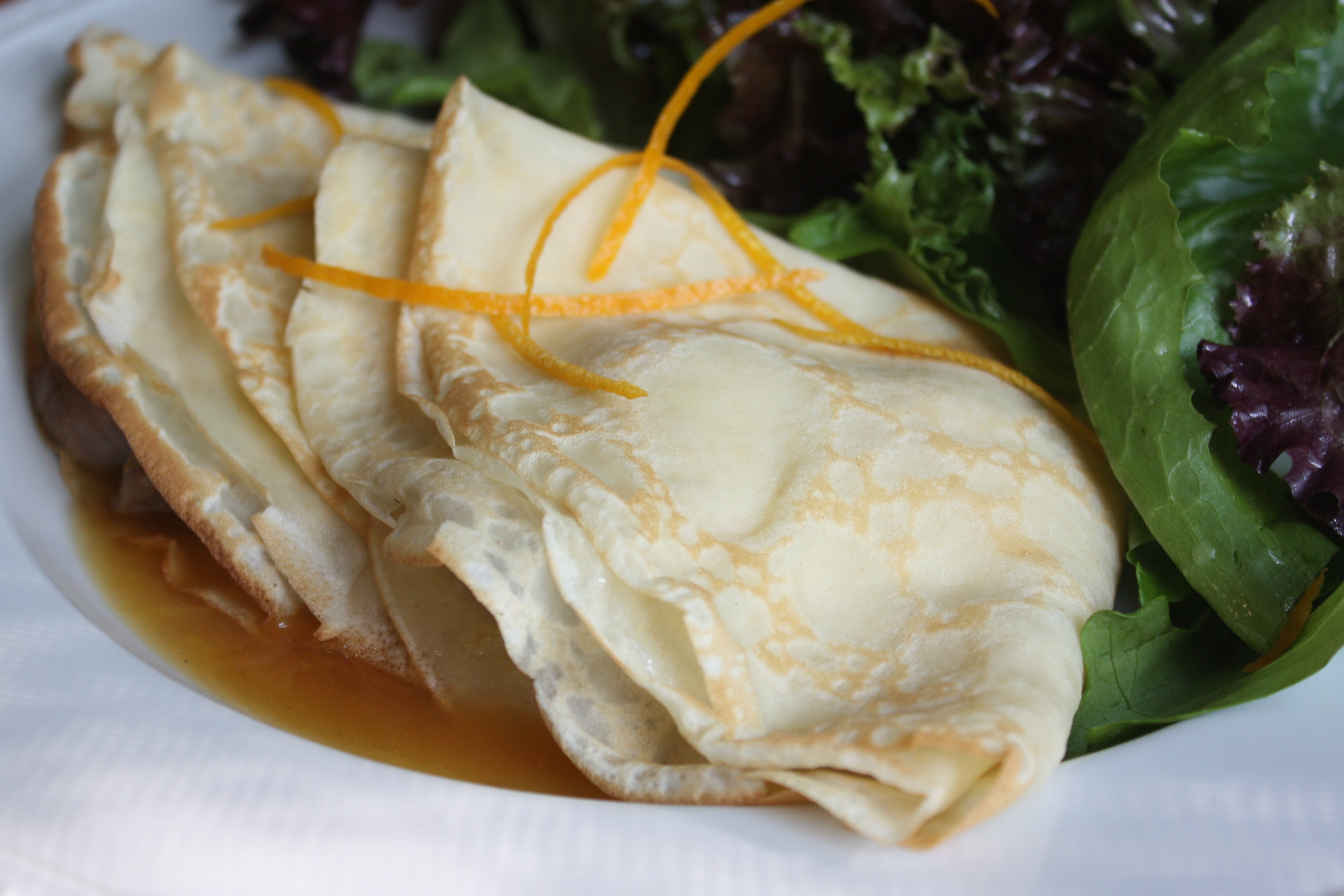 When you’re ready to serve, reheat the sauce in a saucepan. Add the orange segments, about half of the orange zest and the pieces of duck. Toss to gently combine. Simmer gently for a few minutes until the duck and sauce are heated. Remove from the heat. Add the butter and gently swirl the mixture until it melts and blends with the sauce. Place a spoonful of the mixture onto one quarter of the crepe.
