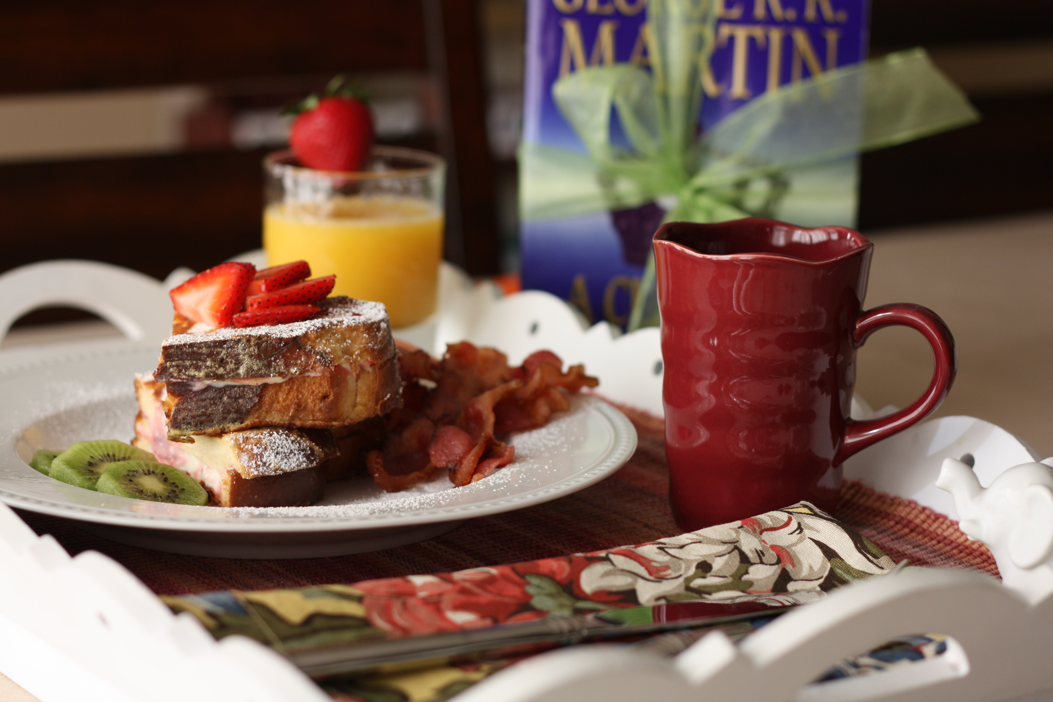 So, this morning we celebrated my husband, the wonderful father, with breakfast in bed. If I were cooking for my own amazing father this morning, there’d be corned beef hash, an egg over-easy, and well-done rye toast on the menu; a man after my own heart or more likely, I after his! (Love you, Daddy!!) But, my husband’s more of a strawberry-stuffed french toast kind of guy with applewood-smoked bacon on the side.