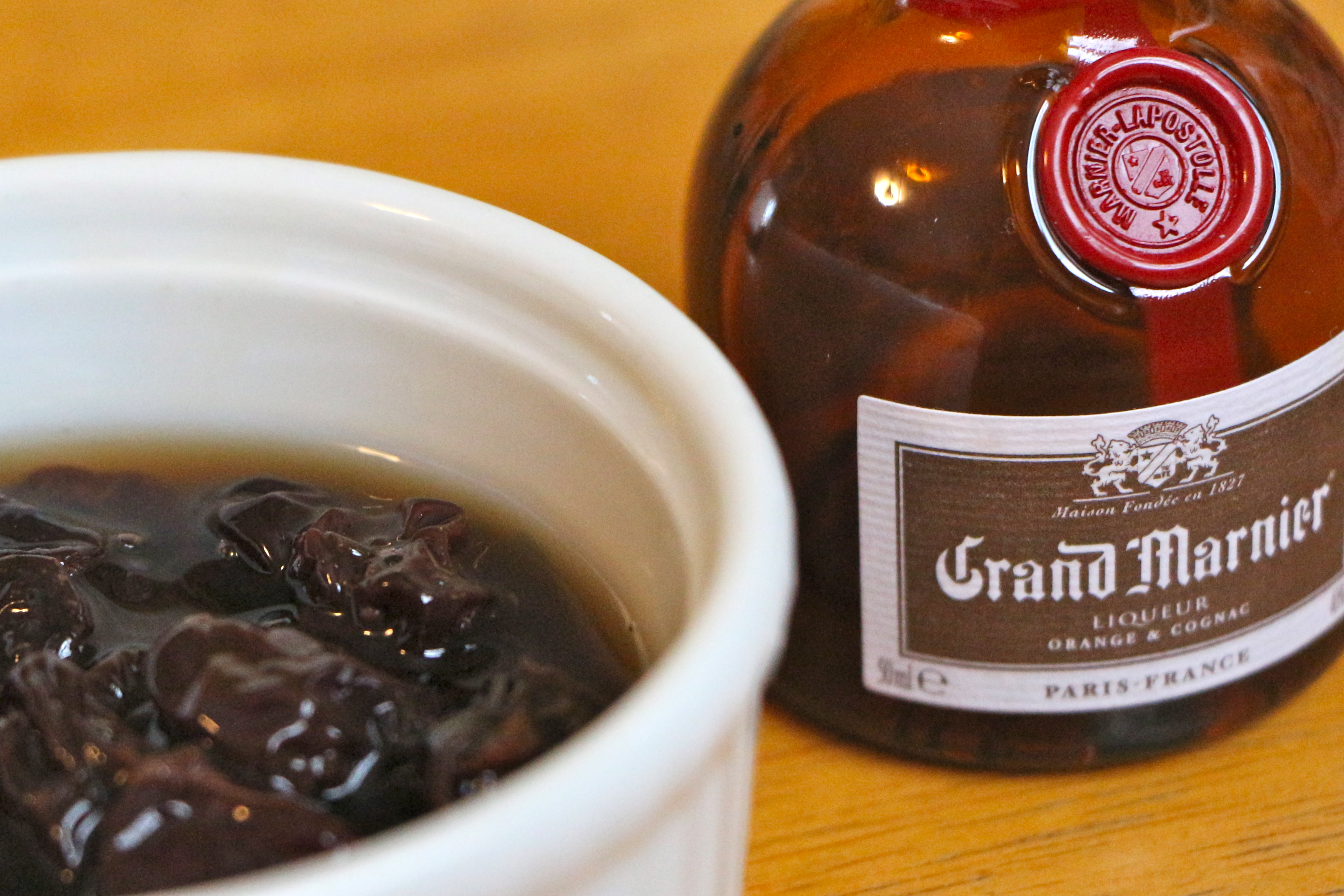 Soak the dried cherries in approximately 1/4 cup of Grand Marnier or orange juice for at least an hour.