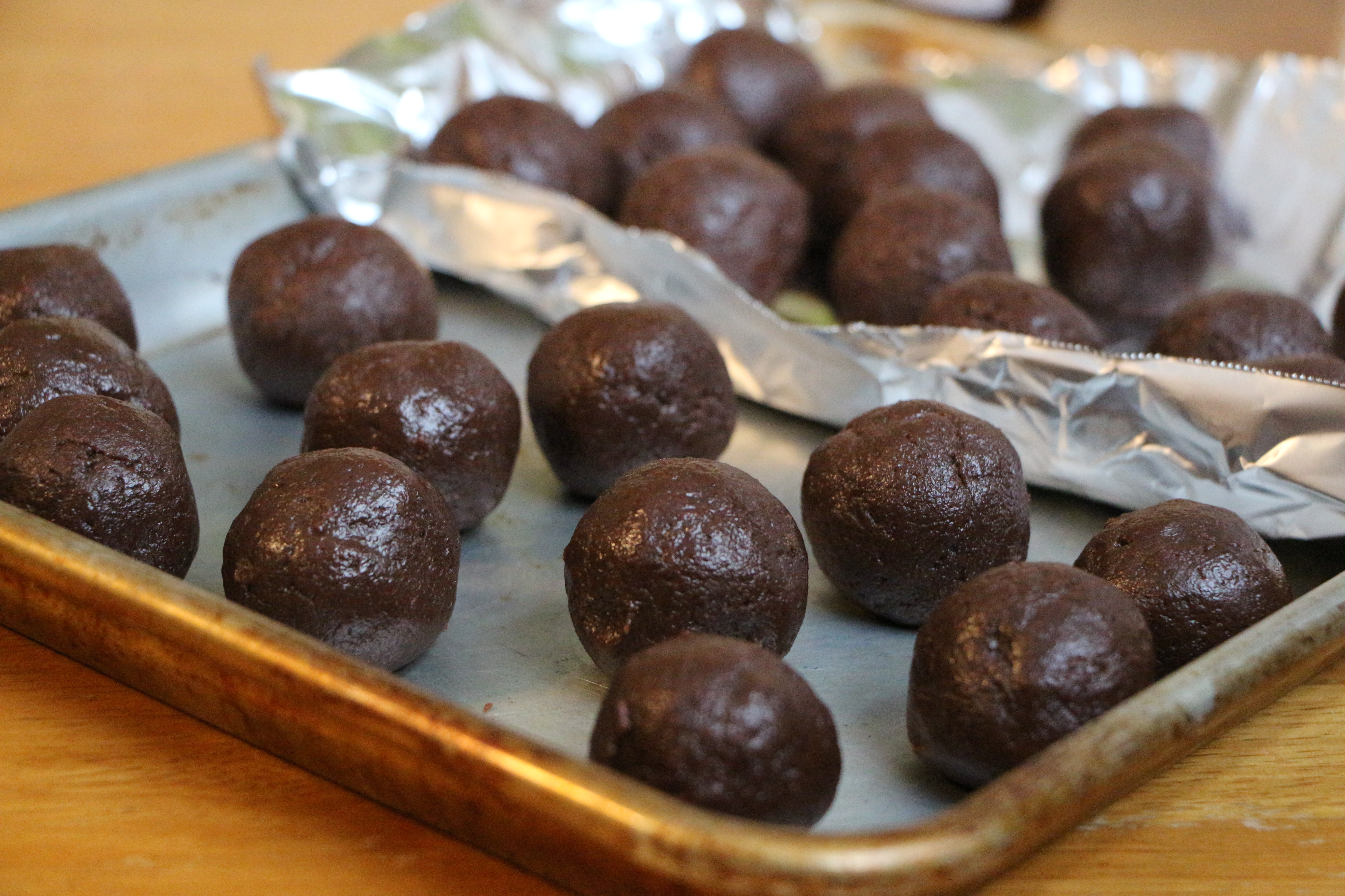 Once the brownies are cool, crumble into small pieces, then place in a food processor. Add the cream cheese and pulse until well-blended and smooth. (A food processor would work best for this task, but it can also be done by hand. If combining by hand, cut off the crispy brownie edges before blending, for a smoother result. If using the food processor, it’s not necessary to cut off the brownies edges.) Roll the mixture into small balls (less than 1″ diameter), inserting a soaked cherry in the center as you roll. Refrigerate until well chilled.
