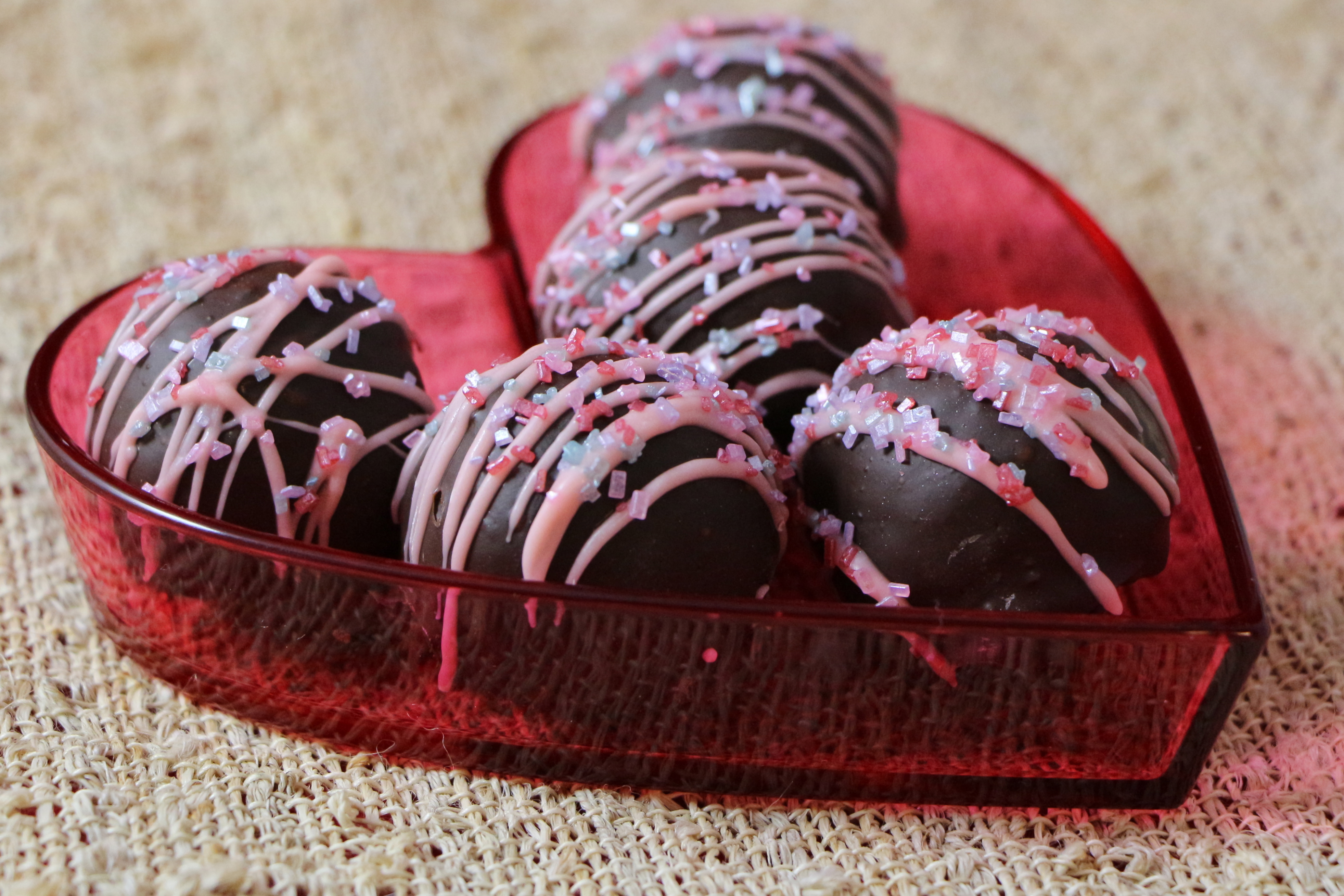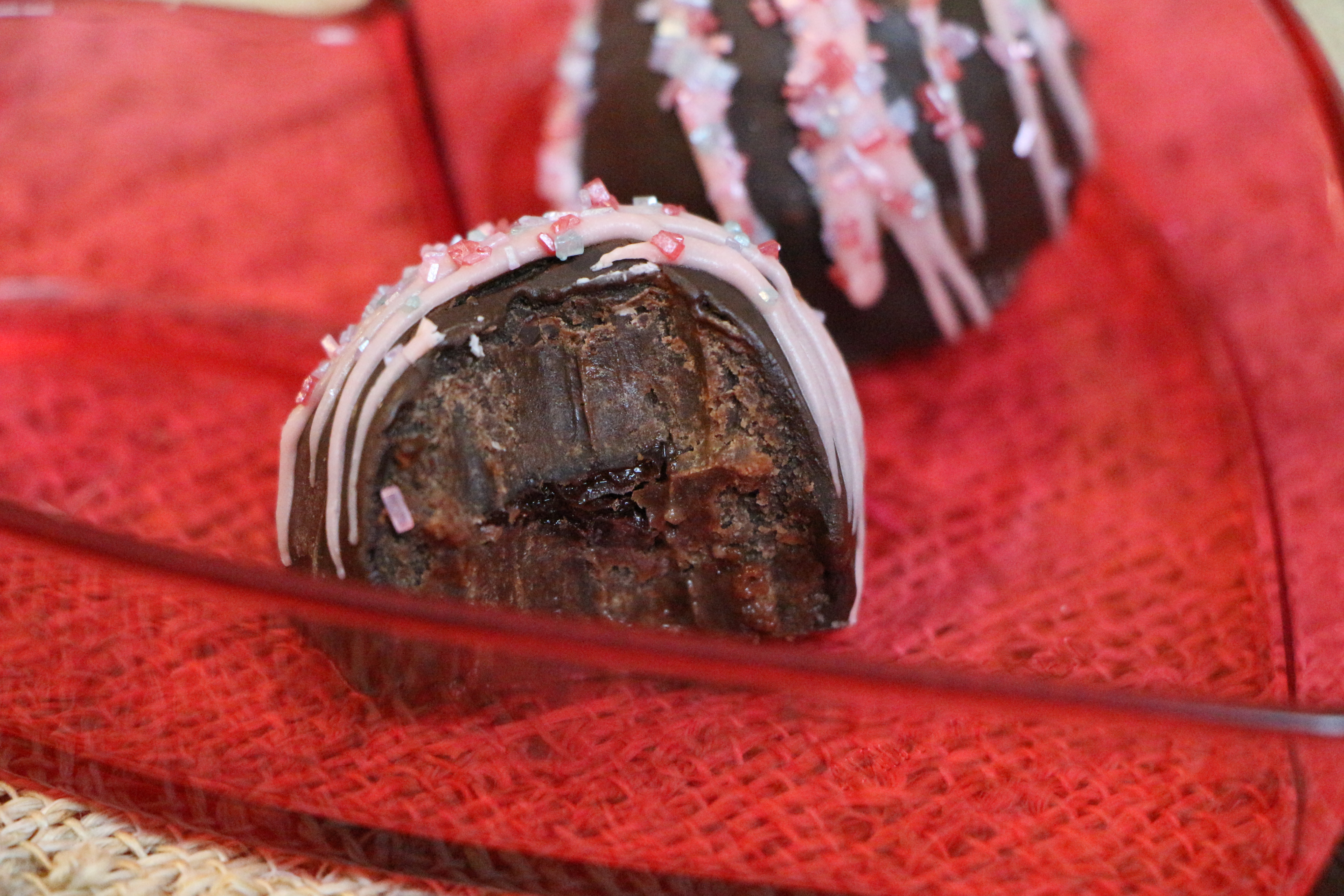 Sweet treats are the perfect way to celebrate the sweetest people in your life, like these absolutely decadent, truffle-like cherry cordial brownie bites. They start with my World’s Simplest Fudgey Brownies, which are then blended with a bit of cream cheese, until rich and smooth. The luscious brownie mixture is then rolled into small balls with a Grand Marnier (or orange juice, for the kiddies) soaked cherry in the center, before being dipped in smooth, melted chocolate. A drizzle of melted pink candy and sprinkles provide the perfect final touches.