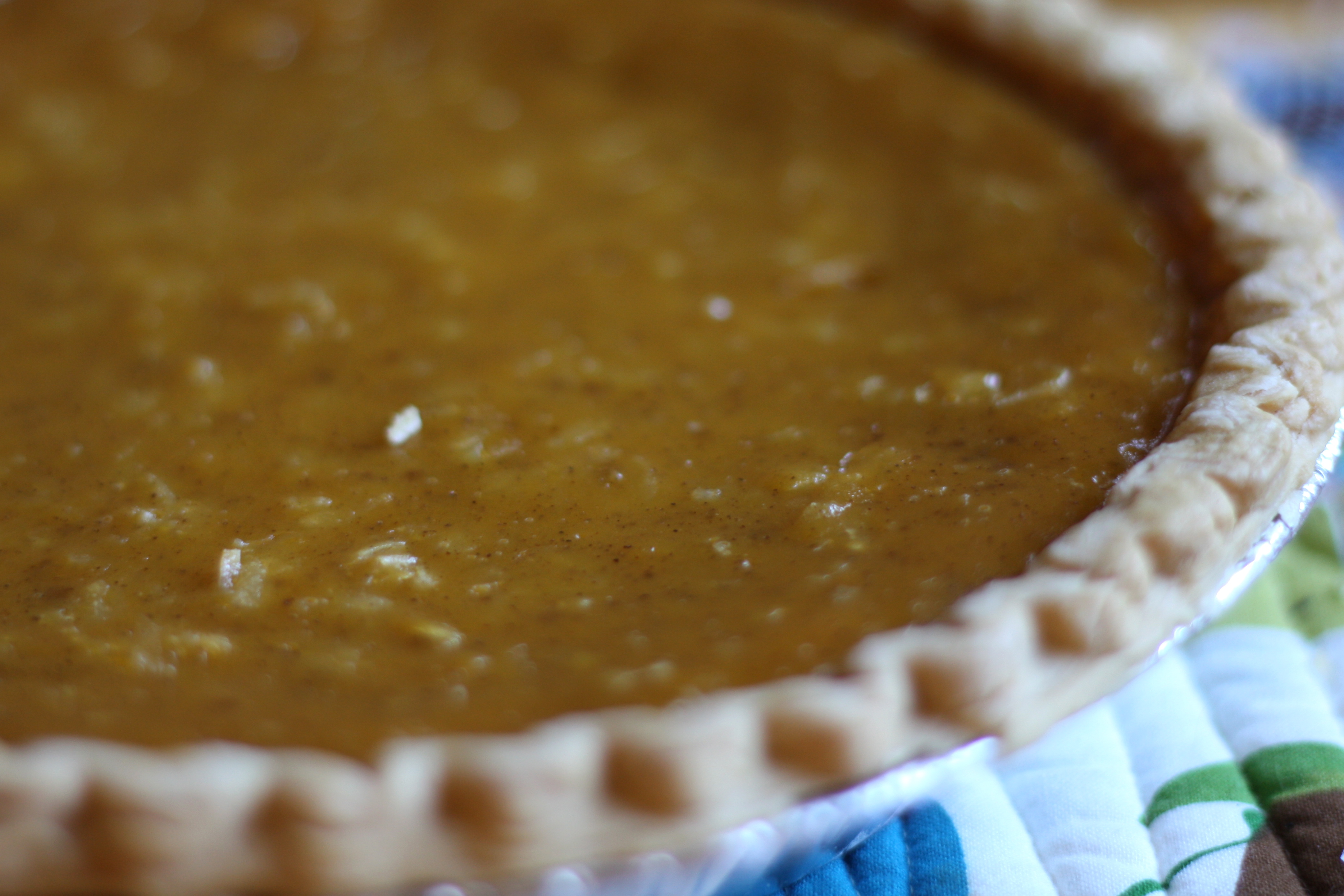 Once the dough is sufficiently large for your pie pan, using the rolling pin to help you transfer the dough into the pan. Carefully press the dough into the pan.