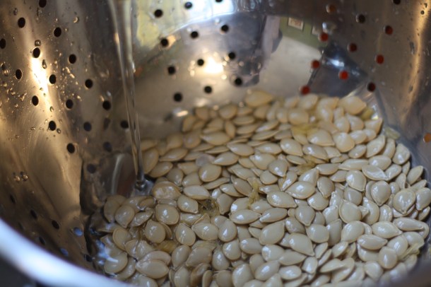 Step 2: Rinse the seeds under cool running water, while removing any stringy, orange pulp.
