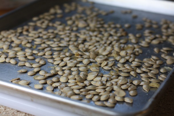 Step 4: Spread the seeds onto a baking sheet. Drizzle the seeds with a little olive oil and sprinkle with salt and pepper. Move the seeds around to evenly distribute the oil and seasonings.