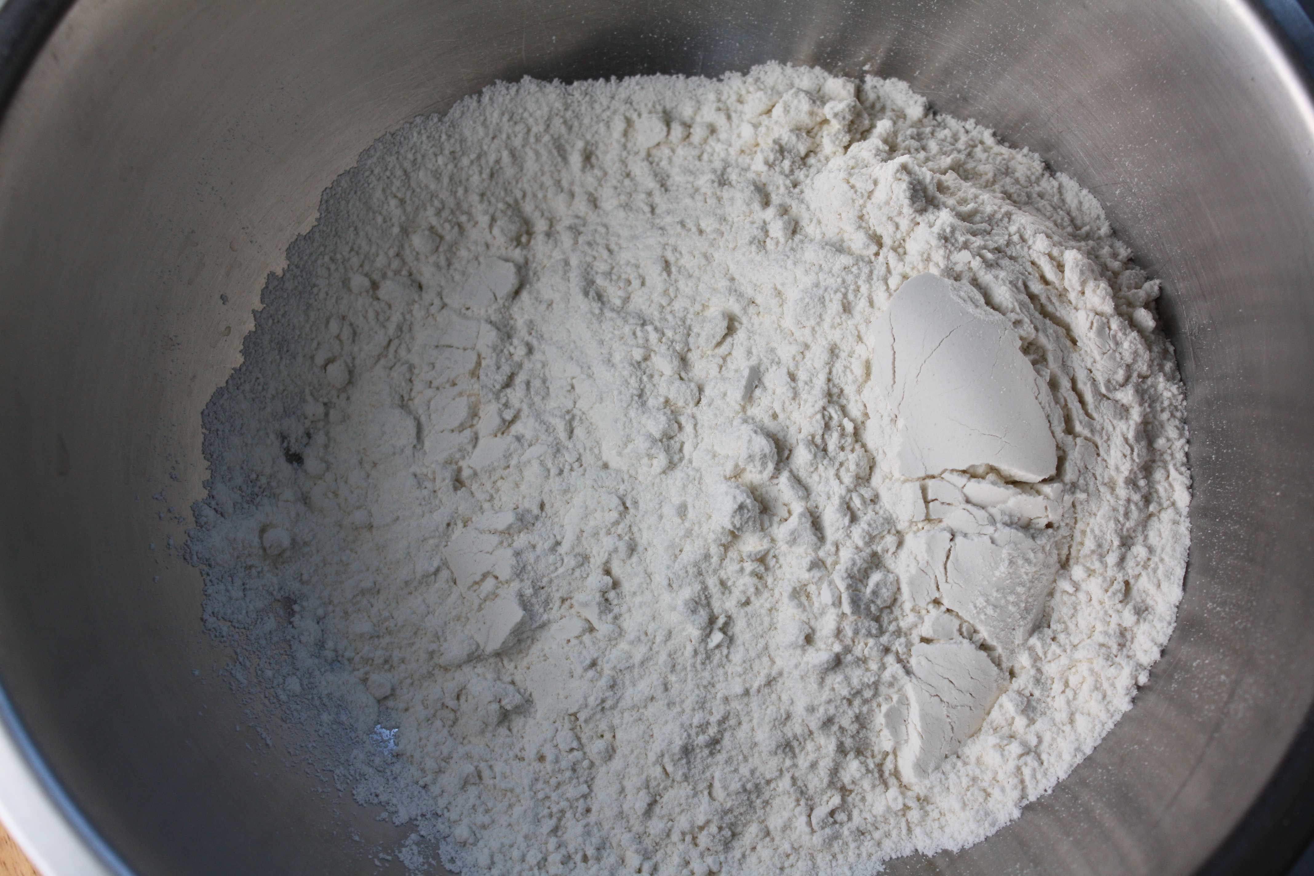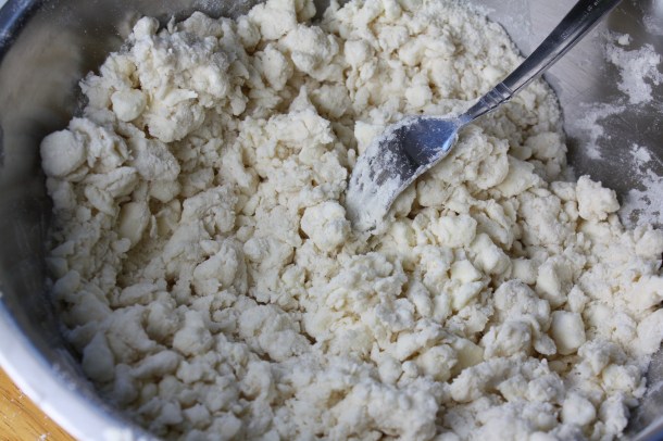 You’ll know you’ve added enough water once the clumps of dough stick together when pressed.