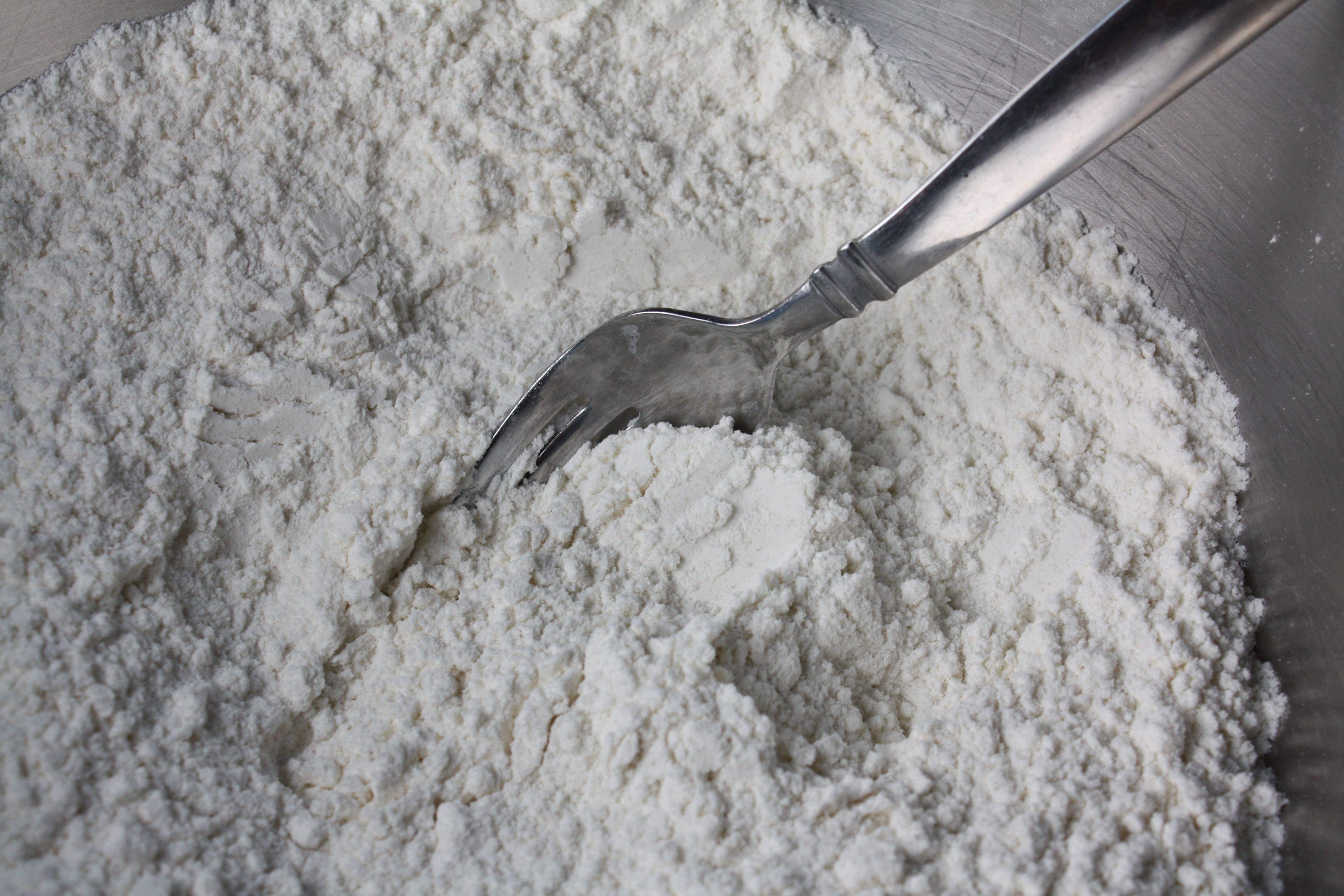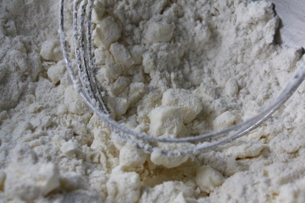 Use a pastry blender to cut the butter into the flour mixture, until the butter appears like flour-coated pea-sized pieces.