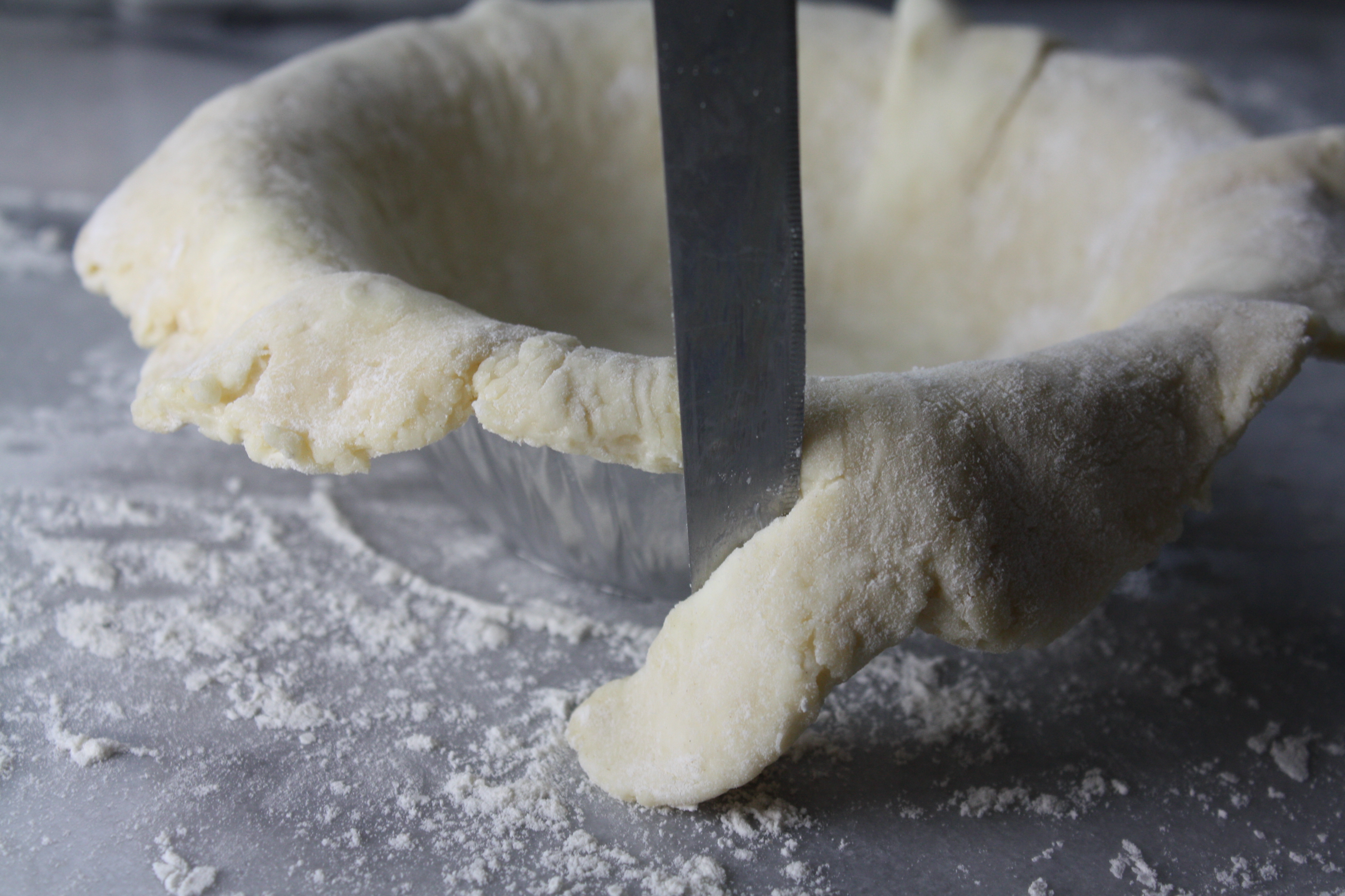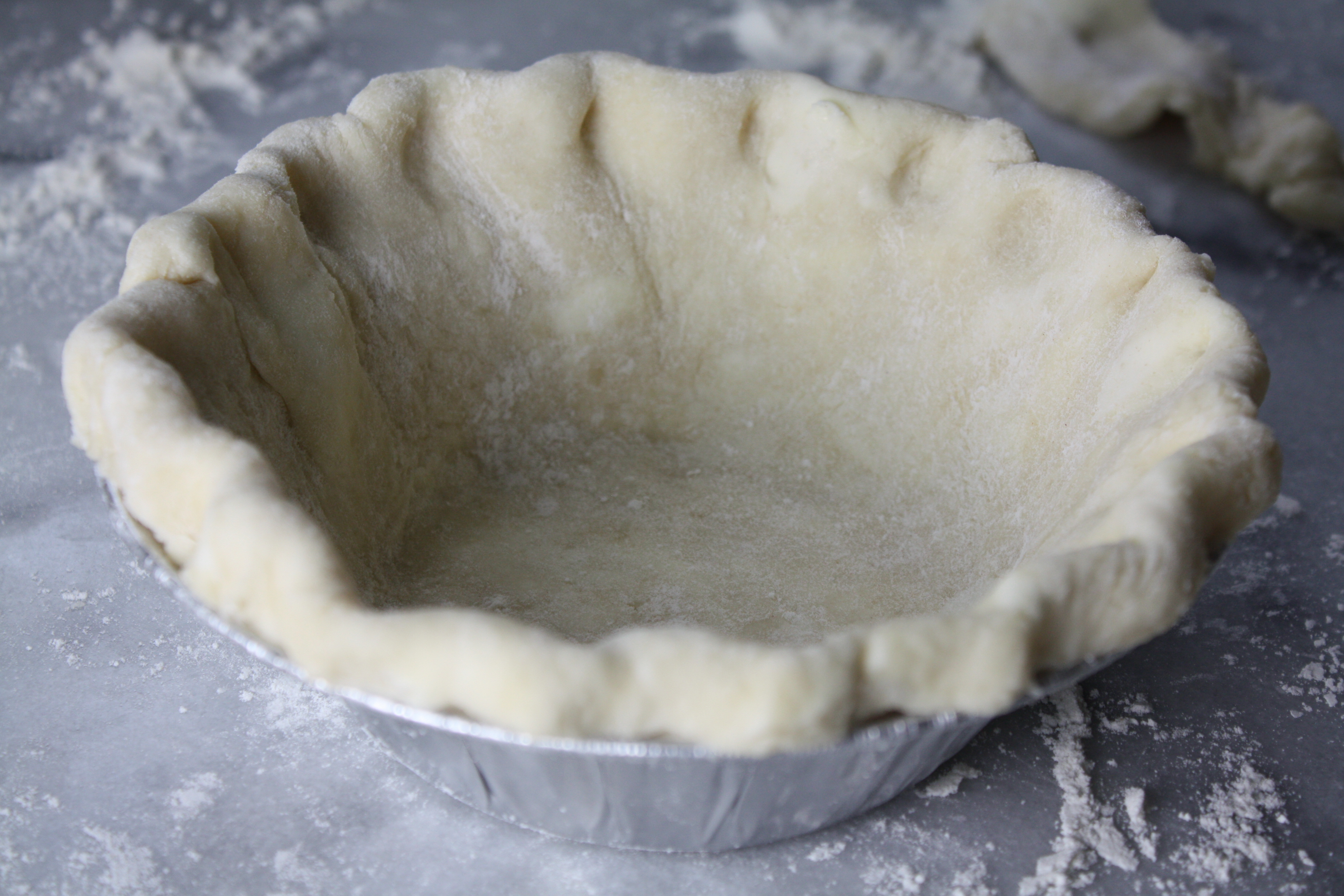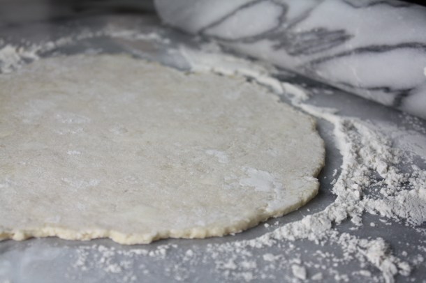 Once cool, roll out the dough on a well-floured surface, into a roughly circular shape, large enough for your pie pan. Periodically shift the dough to ensure it is not sticking. Add more flour under the dough, if necessary.