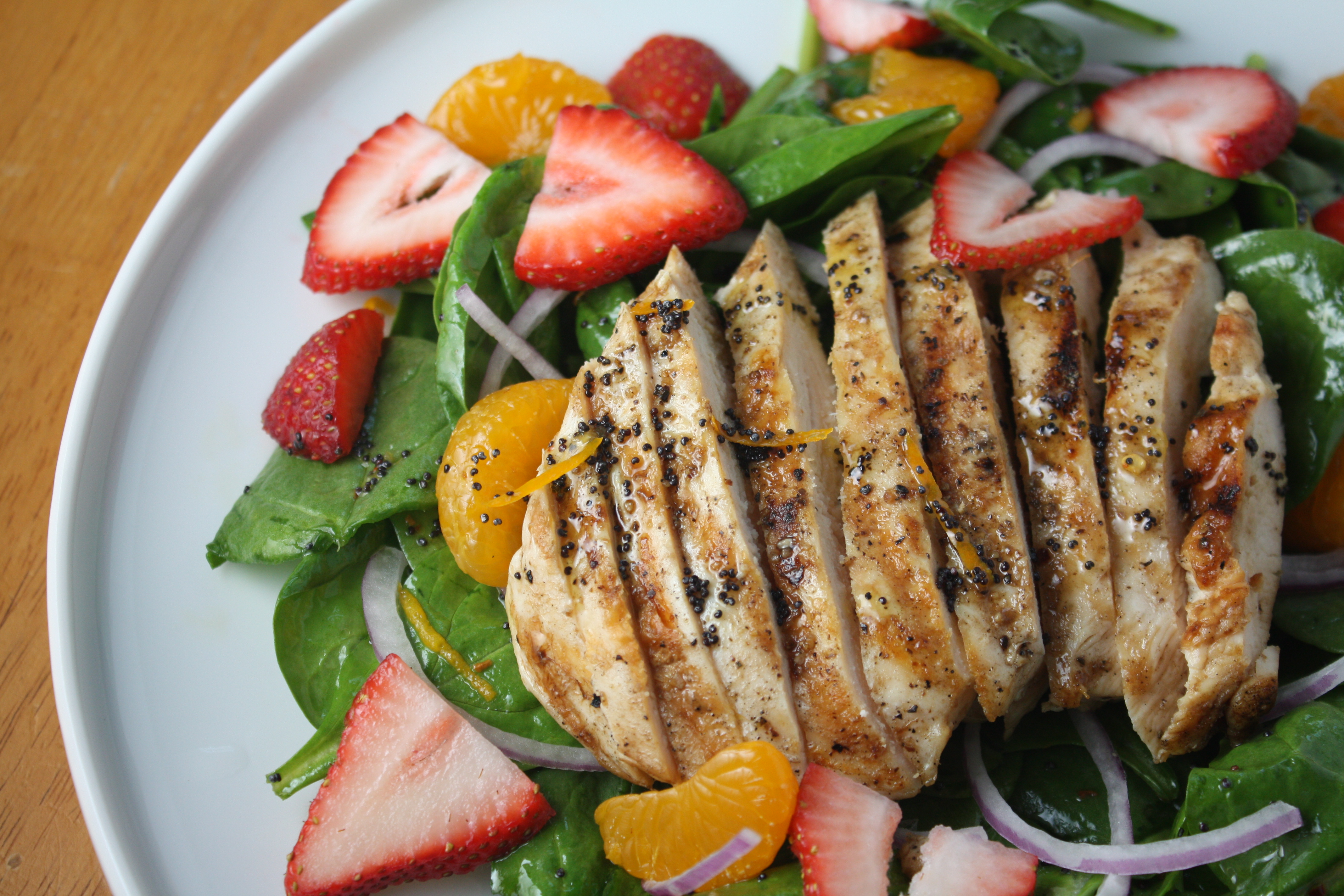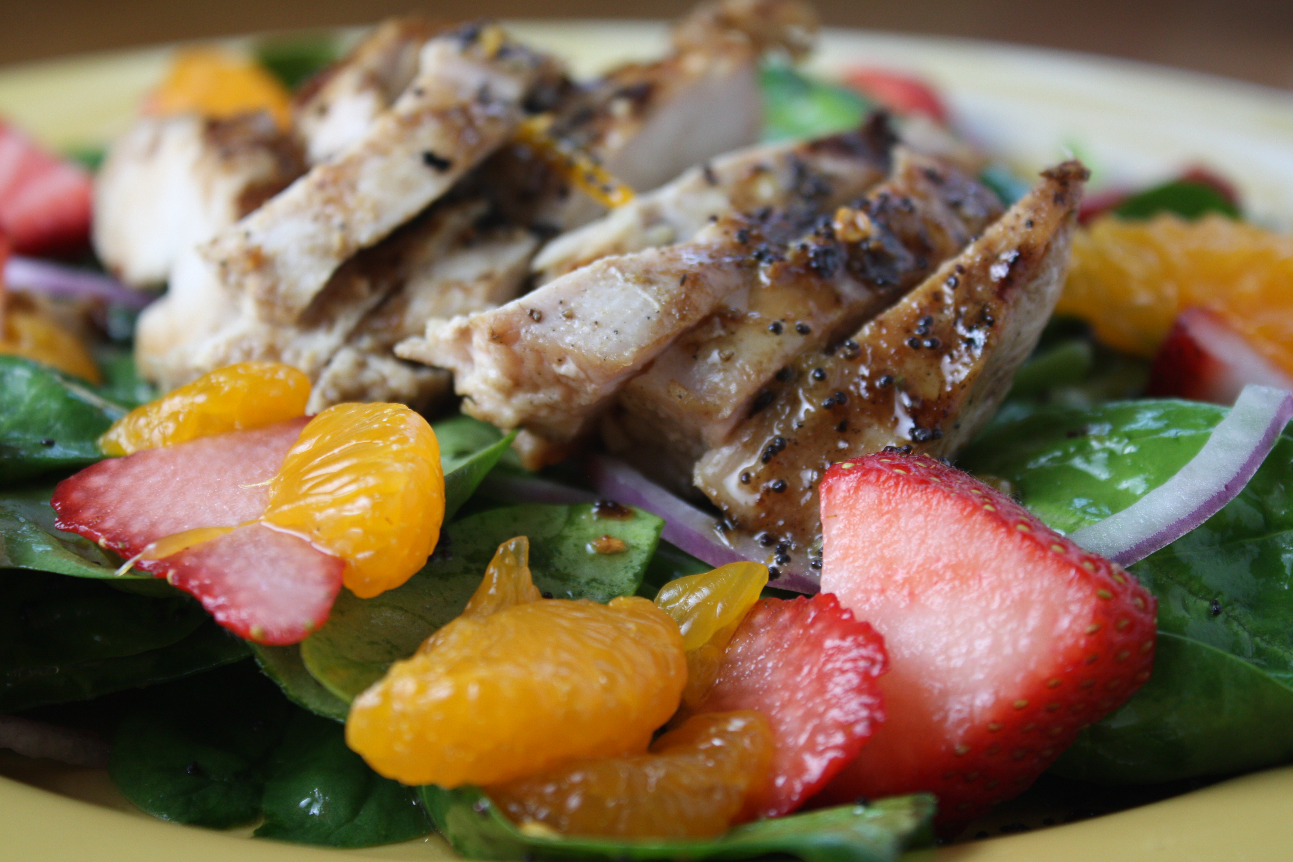 I’ve been crushing on Panera’s Spinach Power Salad ever since they introduced it to the menu. I could eat it everyday, but that be bad for my wallet. So, I’ve come up with my own version of a salad inspired by Panera’s tasty offering. My salad features the same fresh baby spinach, topped with sauteed mushrooms and onions, crispy bacon, protein-rich eggs, and crispy garlic-pepper onion straws, tossed in a simple vinaigrette made with sweet caramelized onions and a touch of honey. It’s a near perfect combination of flavors and textures, the sort of thing which makes a healthful salad feel like a treat.