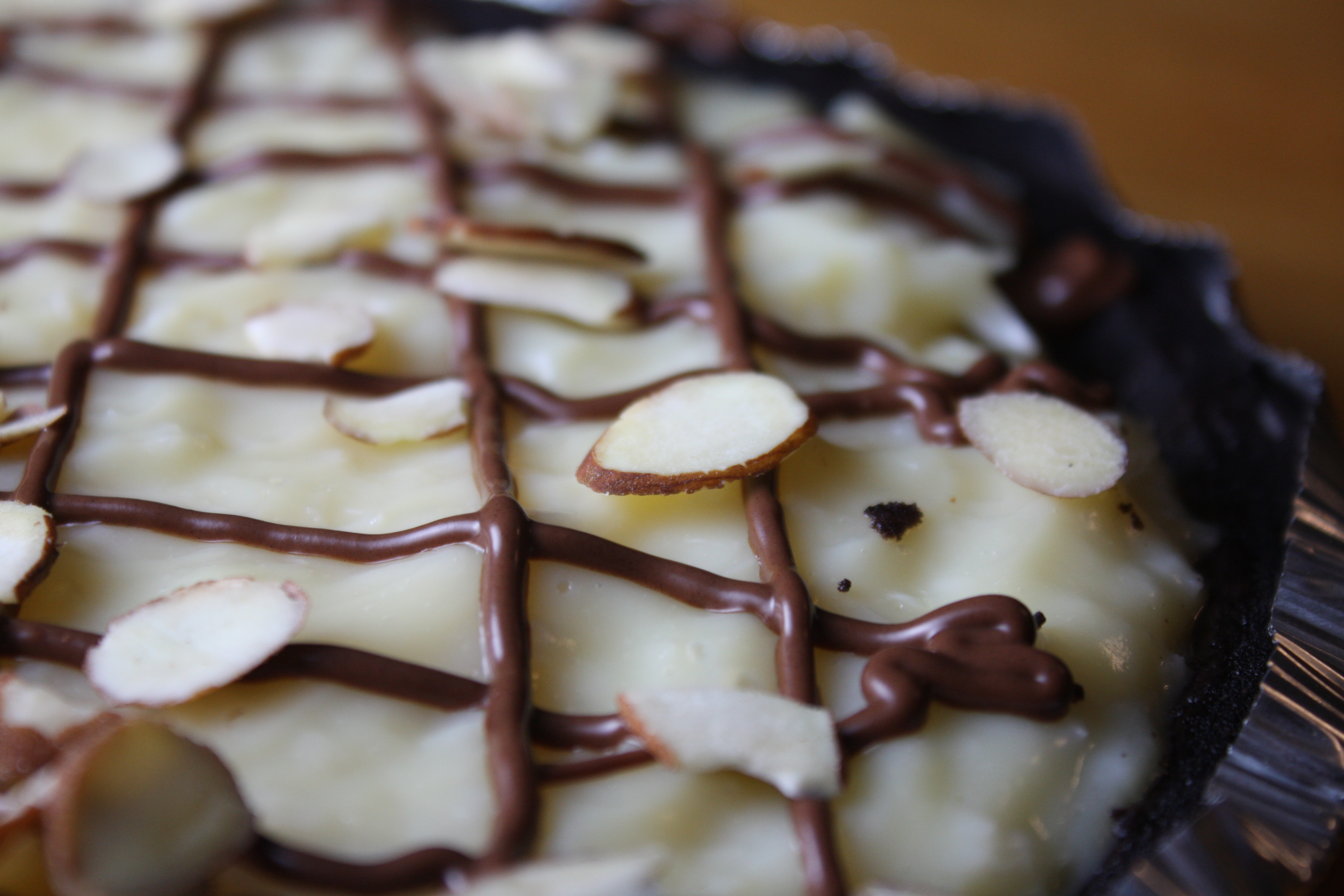 To prepare the milk chocolate ganache: Bring the heavy cream just to a boil. Pour the cream over 2/3 cup of the chocolate chips and stir until smooth. The chips should melt by the heat of the cream, but if necessary, microwave the mixture for 10-15 seconds, then continue stirring until smooth. Pour the ganache into the pie shell. Scatter about half of the sliced almonds over the ganache. Refrigerate to set the ganache. Prepare the custard while the ganache cools.