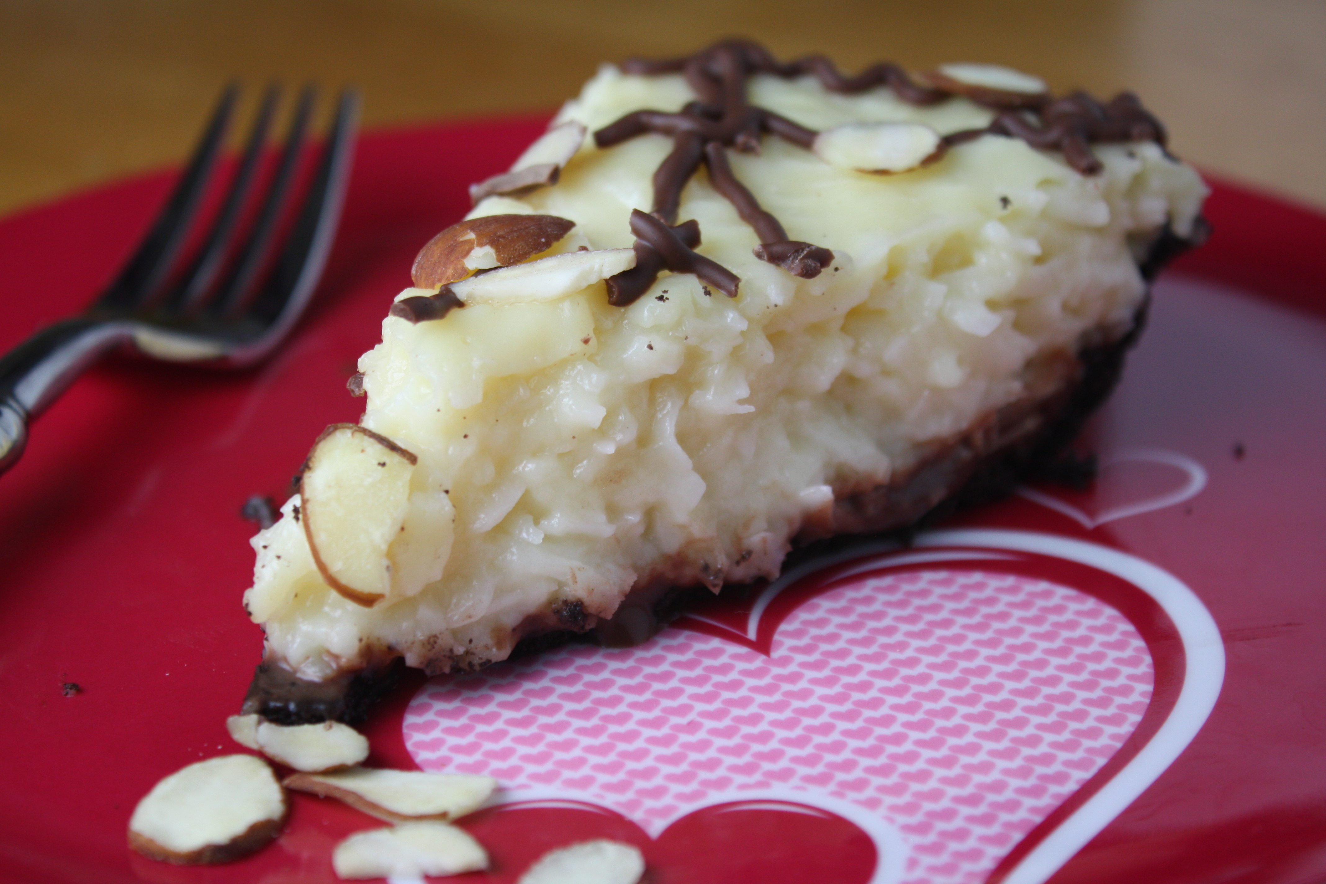 And so, on Valentine’s Day, I will celebrate my love for my five special valentines; my husband, my three little men, and my dad. For my husband, I’ll be making lobster pot pie in a puff pastry shell and filet mignon with caramelized onions and gorgonzola. For my boys, heart-shaped nutella-stuffed french toast with raspberry syrup and berry red smoothies. And in honor of my dad, this Almond Joy Pie. Daddo, I’d send you a slice, if I could. You think one of those padded envelopes might work?? Maybe I should wait until the next time we visit…