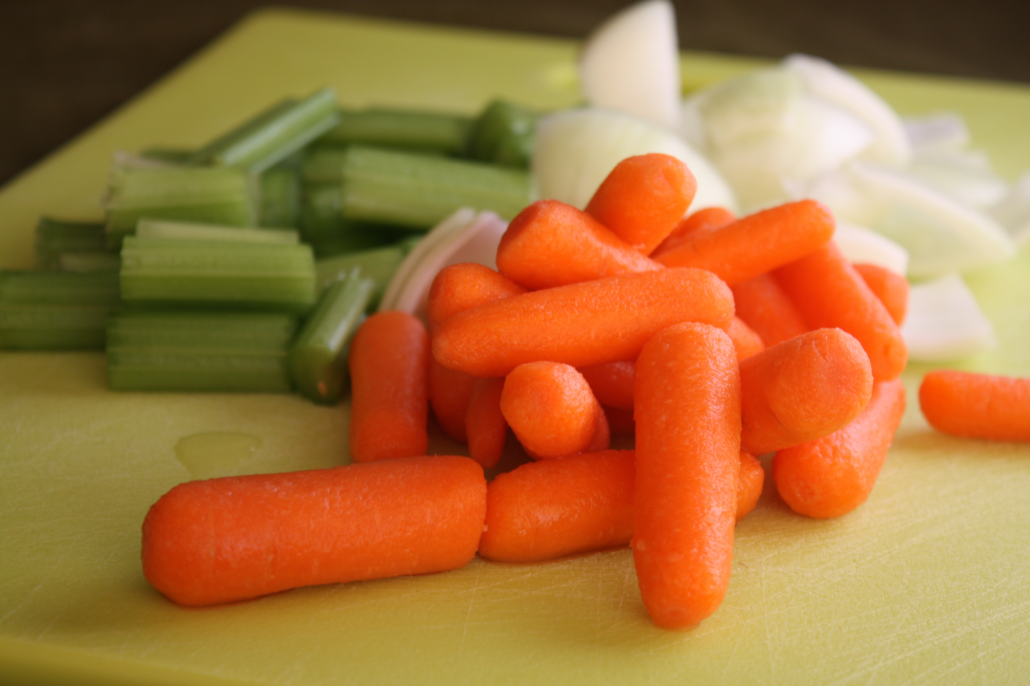 - Throw the chicken in the pot with a bunch of rough chopped vegetables. Use whatever you’ve got on hand; celery, carrots, garlic, onion, shallots, parsley, etc.